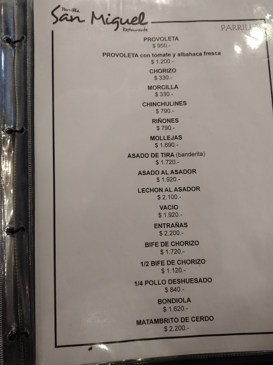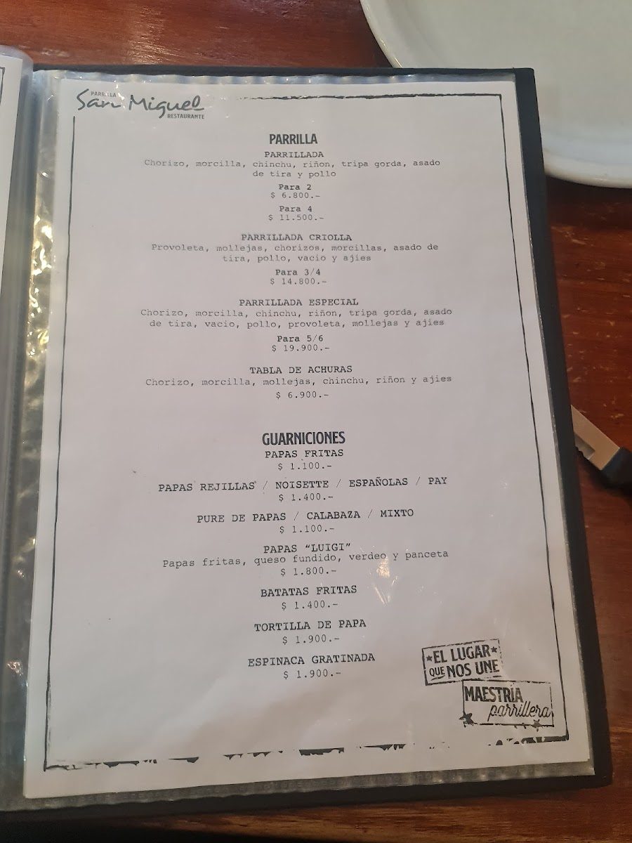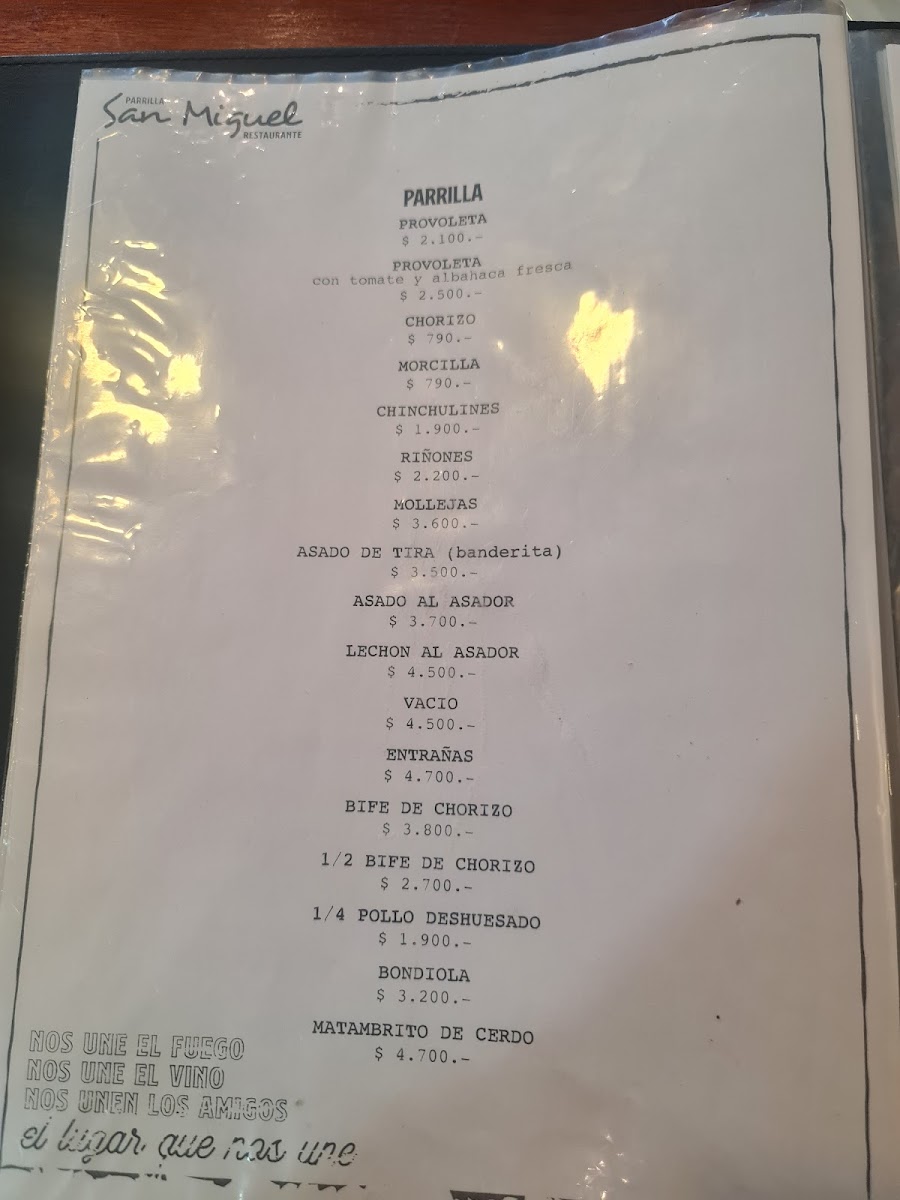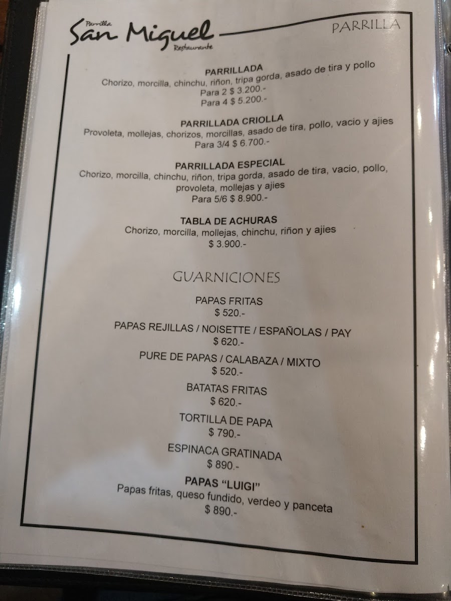 The Parrilla San Miguel Menu offers a delightful mix of authentic Argentine flavors, showcasing the finest grilled meats and traditional dishes. Located in the heart of Santa Teresita, Provincia de Buenos Aires, Argentina, this spot is a favorite for locals and visitors alike. From sizzling steaks to perfectly cooked sausages, everything is prepared with the utmost care and attention to detail. Whether you're craving a juicy rib-eye or the flavorful chorizo, each dish promises to deliver a true taste of Argentine grilling.